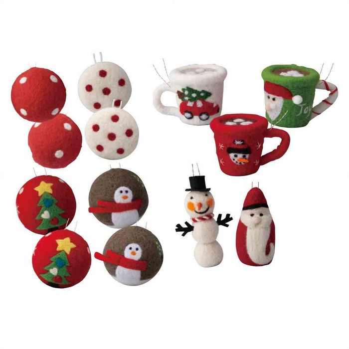 ウールオーナメントデコセット 13個ウールでできた、かわいいクリスマスオーナメントセット。形はボール、カップ、サンタ、スノーマン。柄はツリーはドットなど、いろいろなモチーフがセットで嬉しい!クリスマス 飾り 装飾 オーナメント